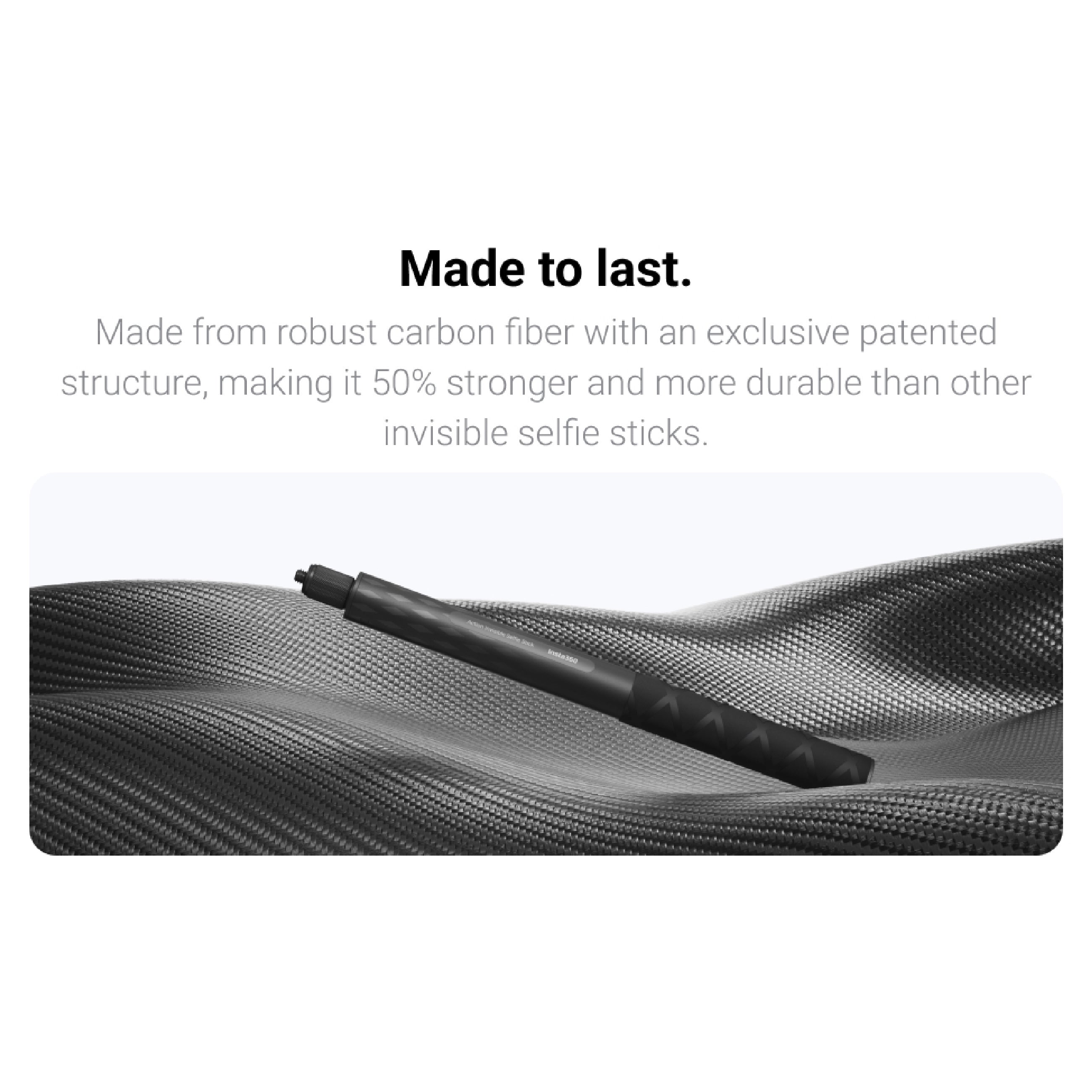 Extend your camera's reach and remove it from your shot altogether with this telescoping Action Invisible Selfie Stick for your action camera from Insta360. The pole's carbon fiber design makes it 50% stronger than other selfie stick materials. It extends from a retracted length of 11 to 39.4" long for selfies, action shots, and extreme angles. The stick remains invisible when shooting with 360° cameras. The top of the pole provides a 1/4"-20 screw to mount your camera or accessory.