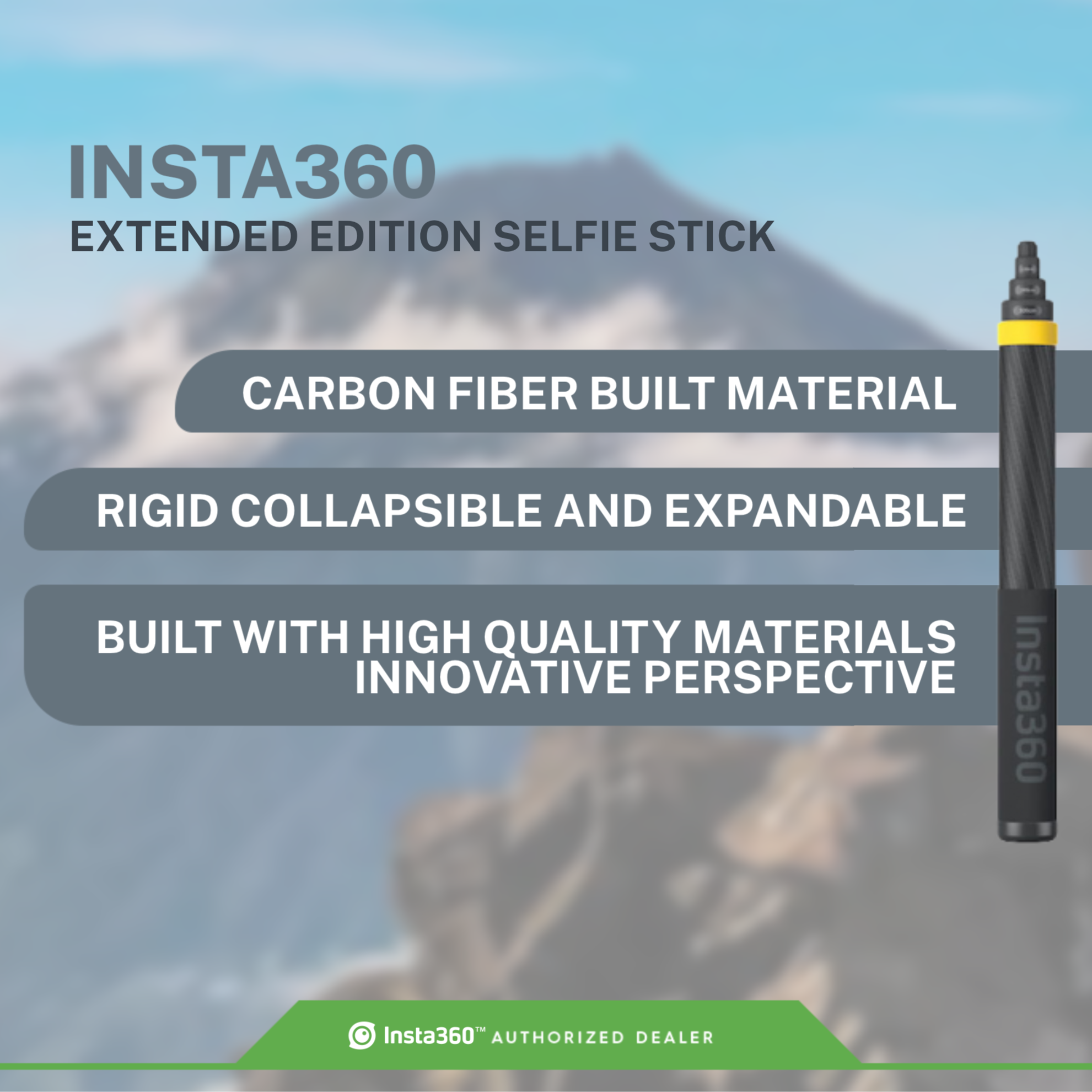 Extend your camera's reach with this redesigned telescoping Extended Selfie Stick for your X3, ONE RS, ONE X2, ONE R, ONE X, ONE, and all cameras from Insta360. This bend-resistant carbon fiber pole weighs only 12.8 oz and extends from a retracted length of 14" to 118" long for selfies, action shots, and extreme angles. The stick is also "invisible" and can be removed from your shot in selfie mode.