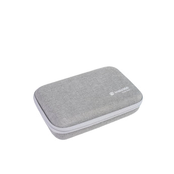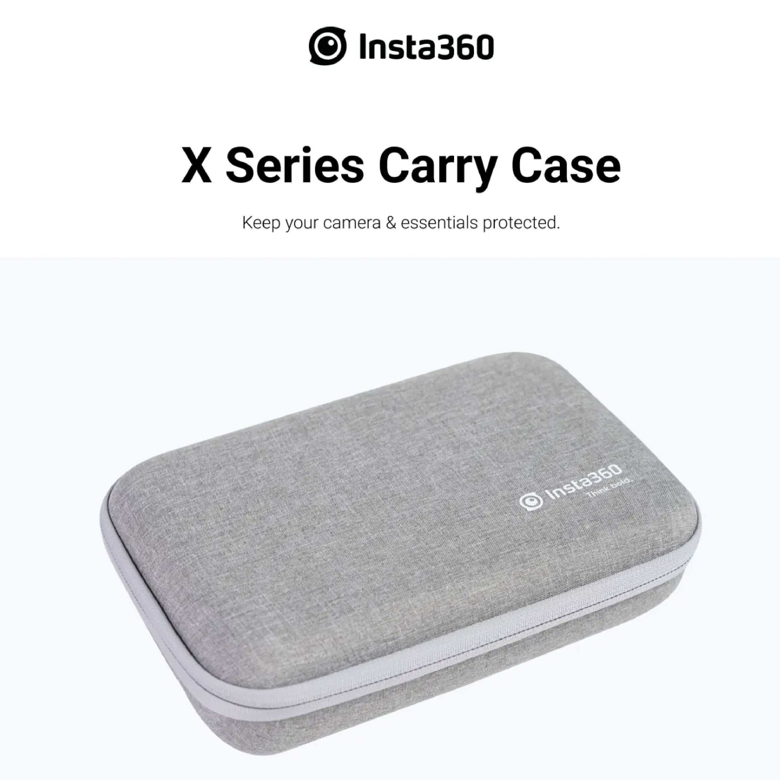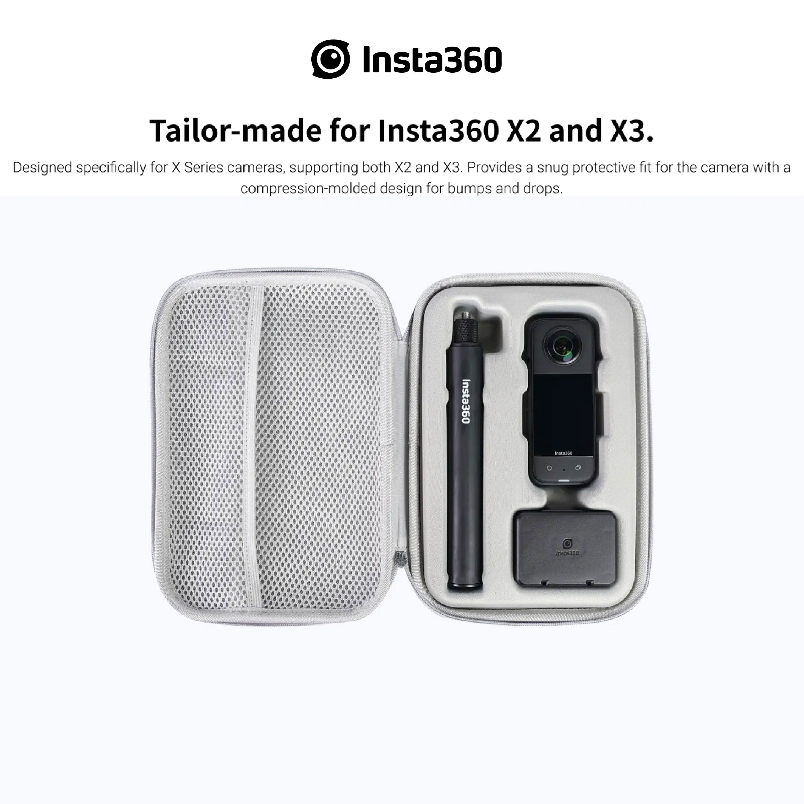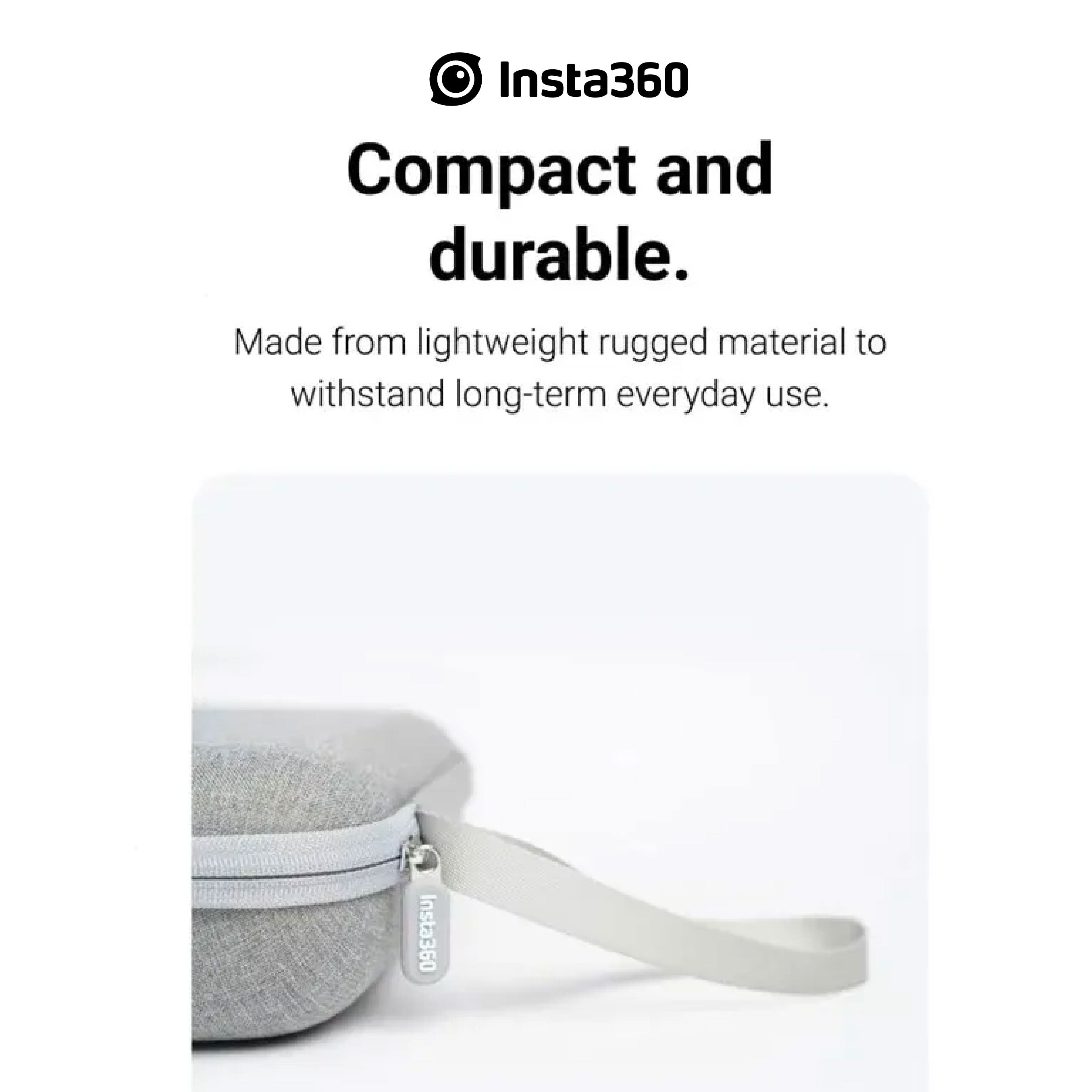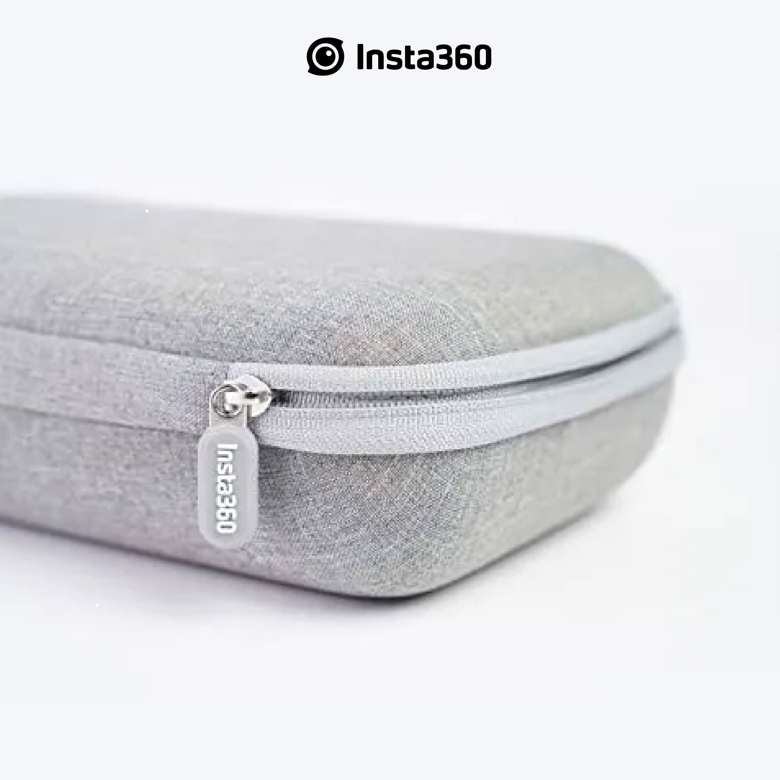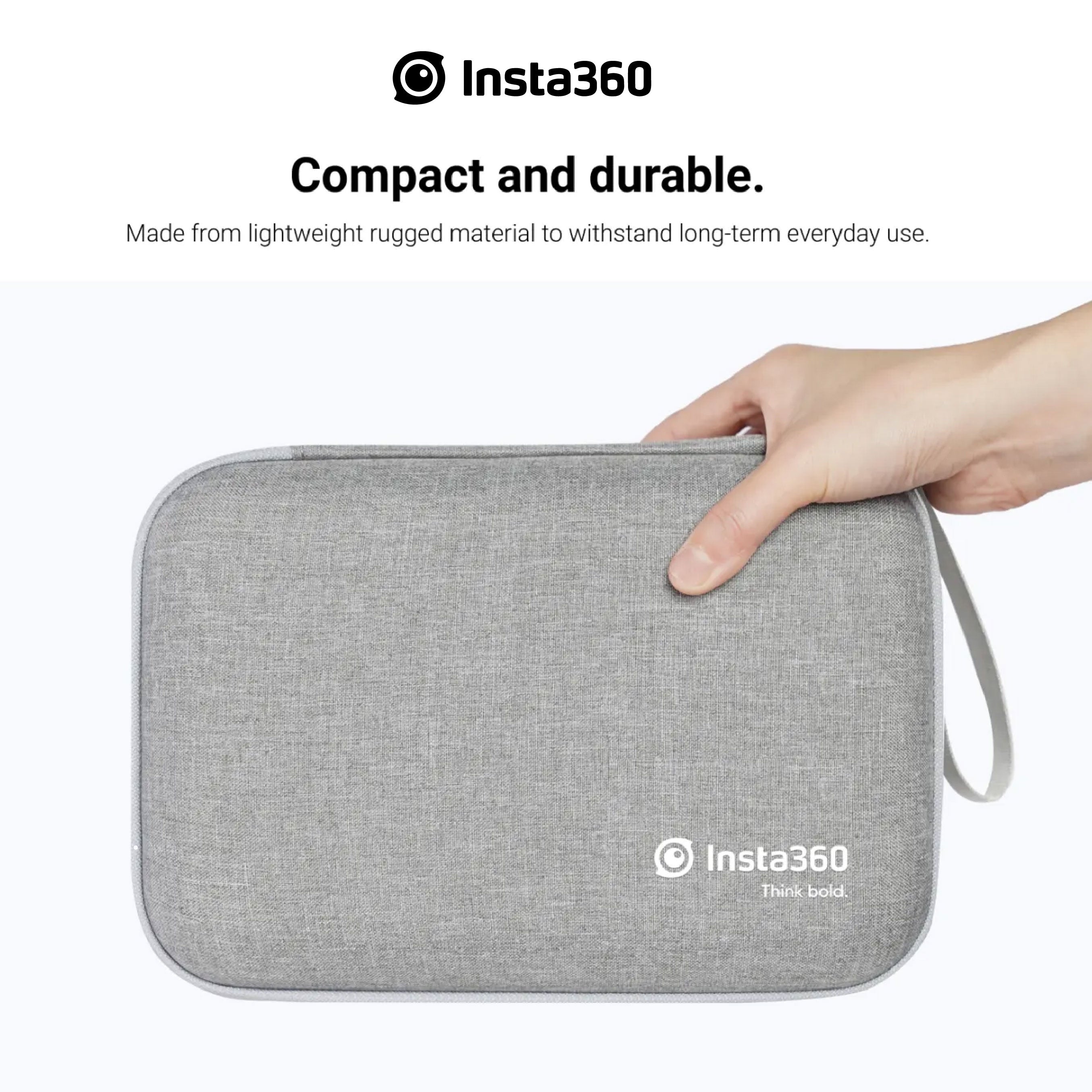 This Carry Case from Insta360 is a compact case that fits the ONE X3 and X2 camera, spare battery, cables, and 28" selfie stick. Its soft fabric exterior keeps it lightweight and stylish, and it closes with a single zipper. Inside, a molded insert provides slots for the 28" selfie stick, battery, and camera, and on the lid, there is a mesh pocket for additional accessories such as cables and mounts. There's a built-in fabric wrist strap on the exterior.