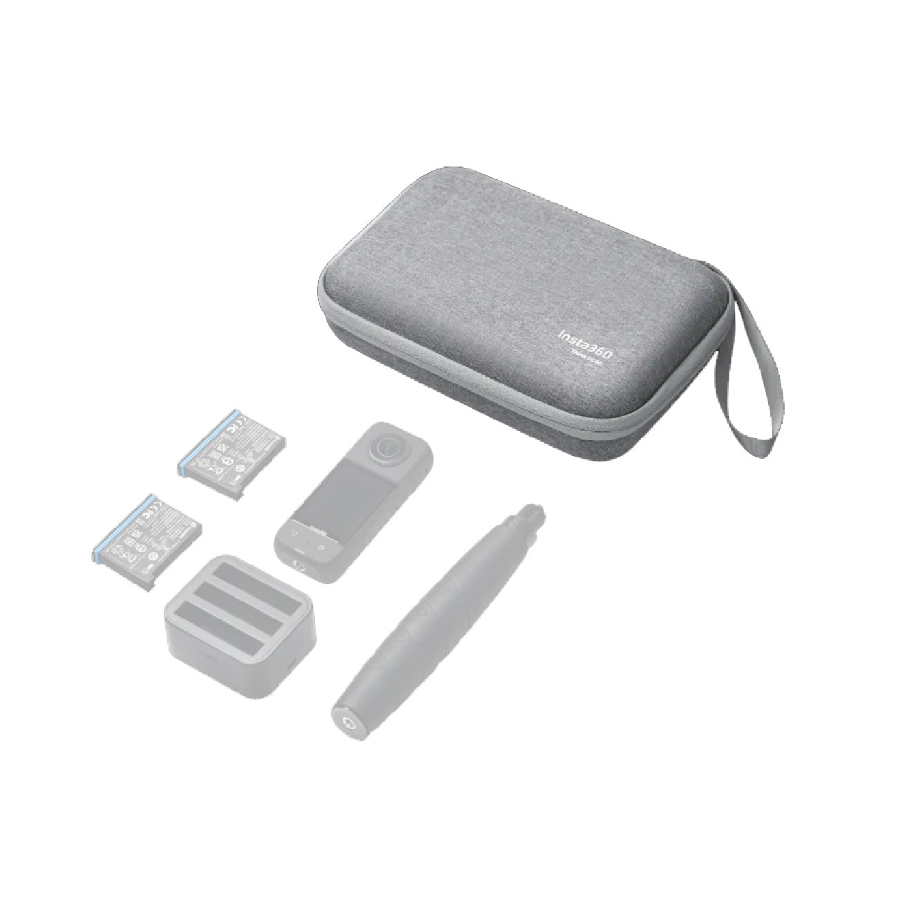 This Carry Case from Insta360 is a compact case that fits the X3, spare batteries, fast charging hub, and a 33.5" invisible selfie stick. Its soft fabric exterior keeps it lightweight and durable. Inside, a molded insert provides slots for the 33.5" invisible selfie stick, fast charging hub, and the camera. On the lid is a mesh pocket for additional accessory storage, such as spare batteries and cables. There's a built-in fabric wrist strap on the exterior.