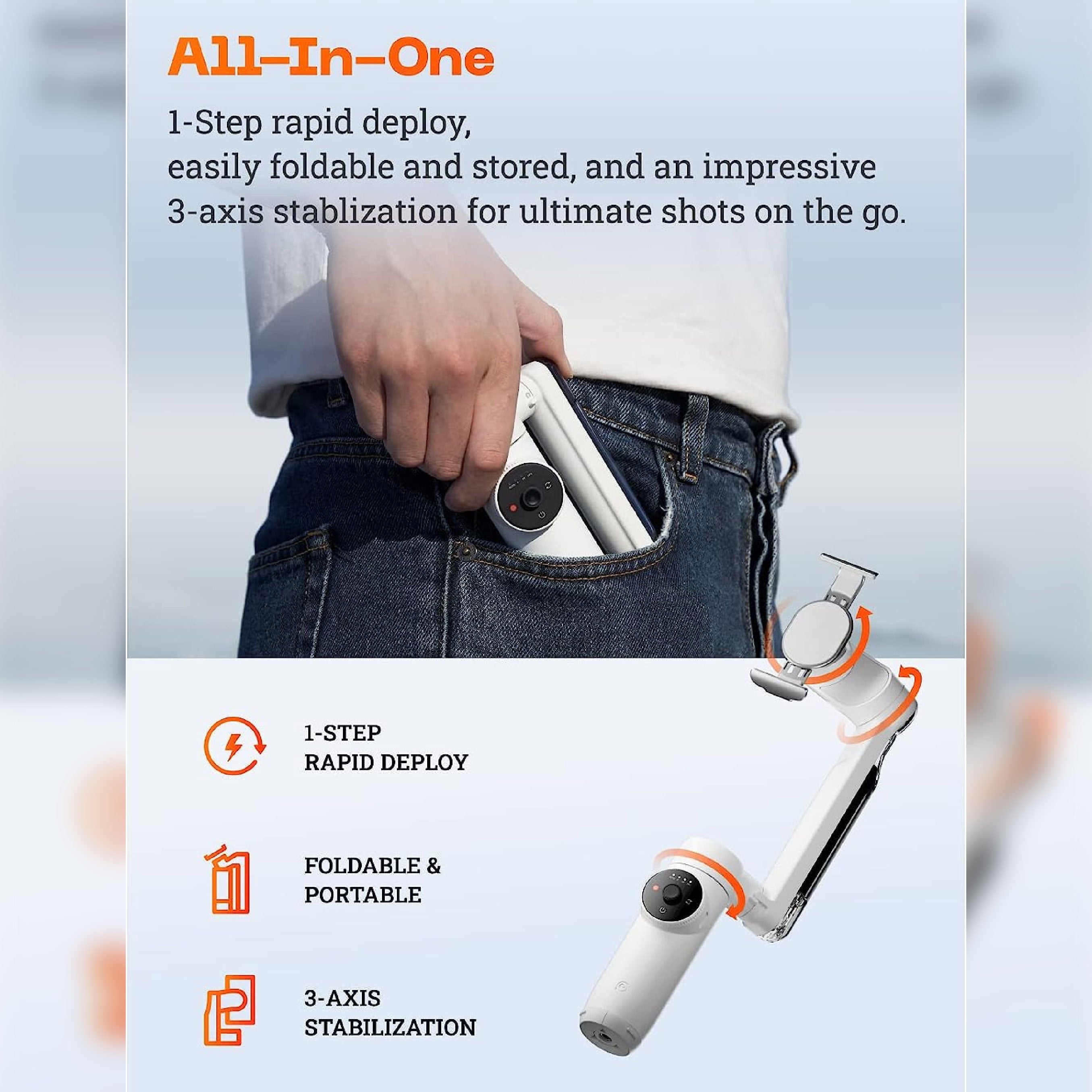 Insta360 Flow is an AI-powered smartphone stabilizer for easy on-the-go shooting and editing. The only smartphone gimbal with both a built-in selfie stick and tripod, 3-axis gimbal stabilization and AI tracking, Flow elevates your phone into a portable content creation tool.