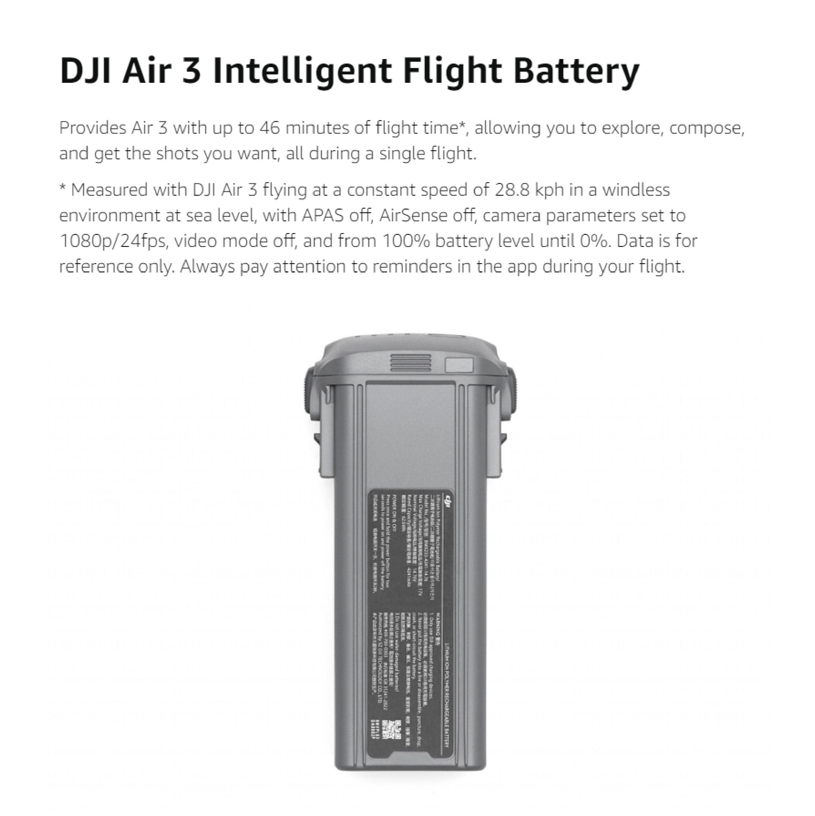 Each DJI Intelligent Flight Battery for Air 3 gives your Air 3 up to 46 minutes of flight time. This extended time over past generations lets you explore farther than ever on each flight, and multiple batteries in your gear bag can keep the Air 3 in the air during long days on location.