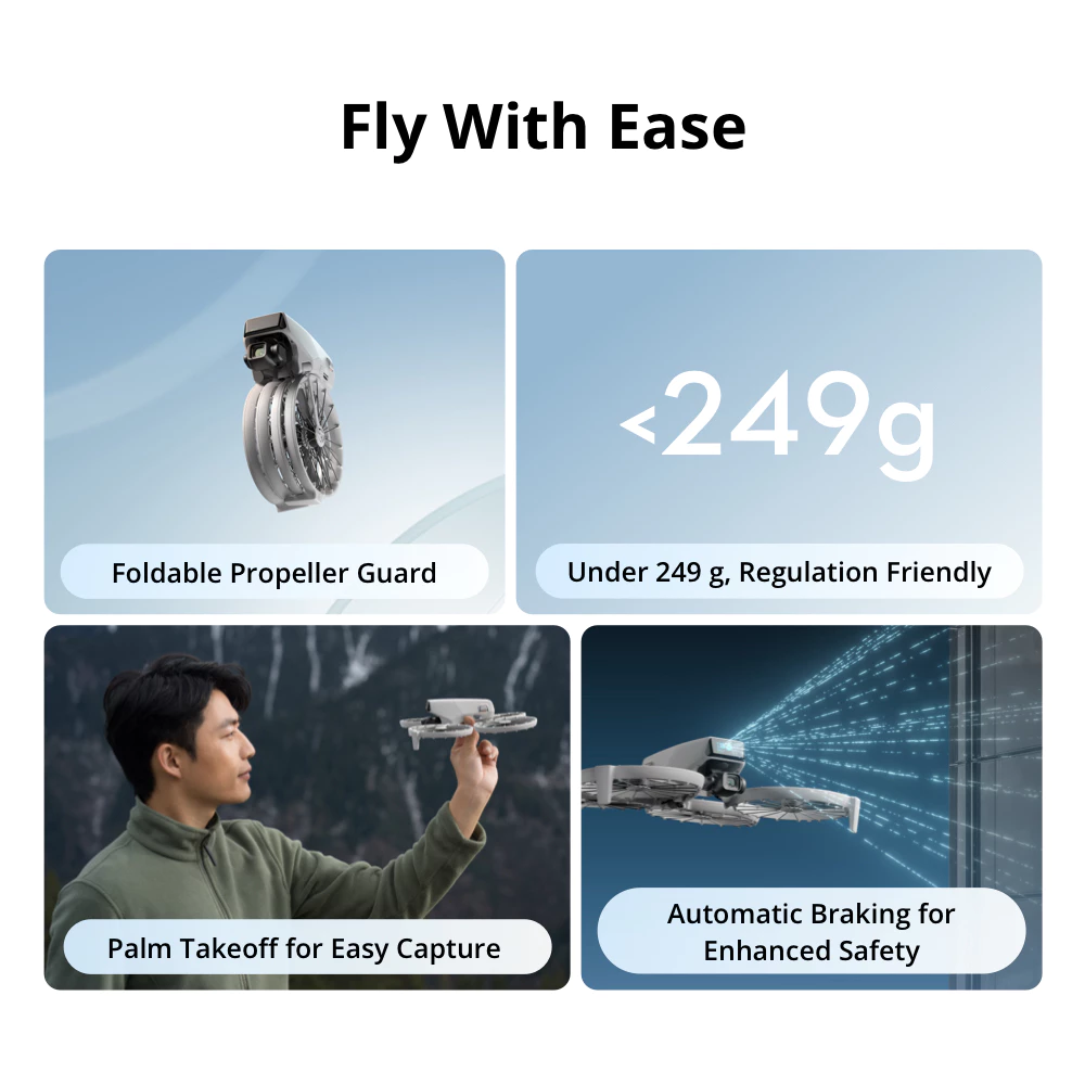 DJI Flip features a stunning compact design with exceptional imaging capabilities. It supports palm takeoff without a remote controller, allowing you to capture moments on the go easier than ever before. Additionally, the AI Subject Tracking feature ensures the main subject stays perfectly framed, so you can set up captivating shots with ease. The innovative design of the Foldable Full-Coverage Propeller Guard seamlessly merges lightweight construction with optimal safety. Whether capturing distant landscapes or close-up portraits, DJI Flip brings visual beauty into every frame.