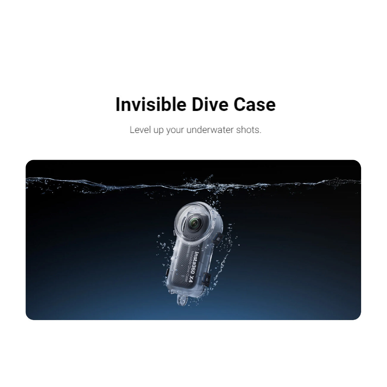 Film improved diving shots from deep below the surface of the water using this Invisible Dive Case from Insta360. Custom-fit to your X4 camera and designed to compensate for water refractions, the clear case maintains the visibility of your touchscreen and controls while ensuring seamless 360° video. It is capable of being submerged up to 164'. A built-in 2-prong mount attaches the case to selfie sticks or mounts of your choice and can be adapted to a 1/4"-20 compatible thread with the included adapter.