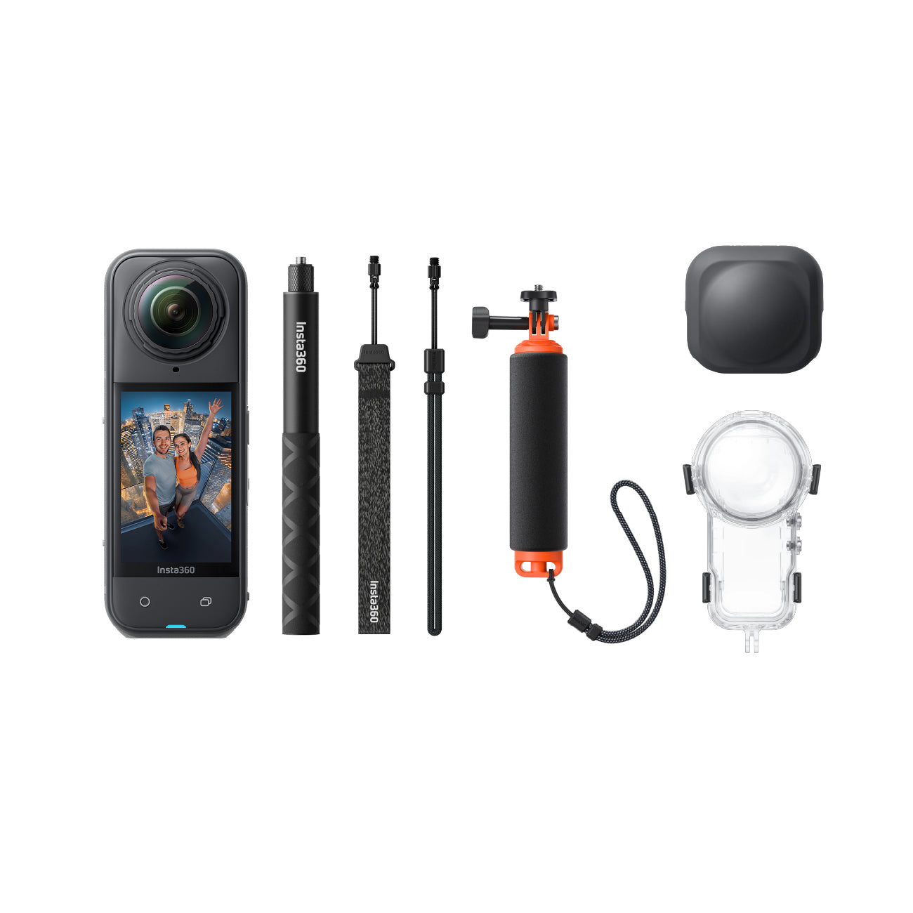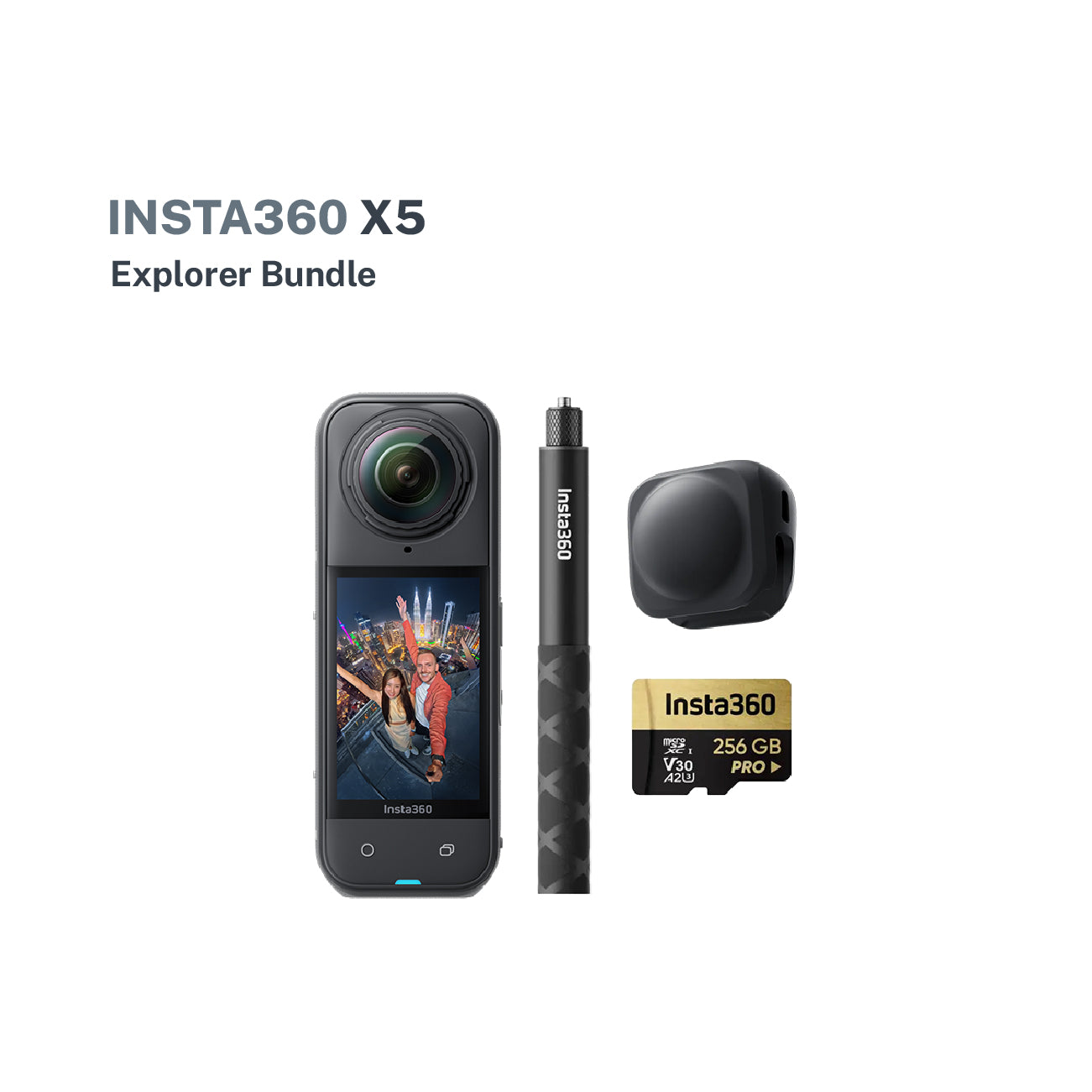 Includes Insta360 X5 standard bundle, 114cm Invisible Selfie Stick, Extra X5 Battery, Lens Cap, Insta360 X5 Battery