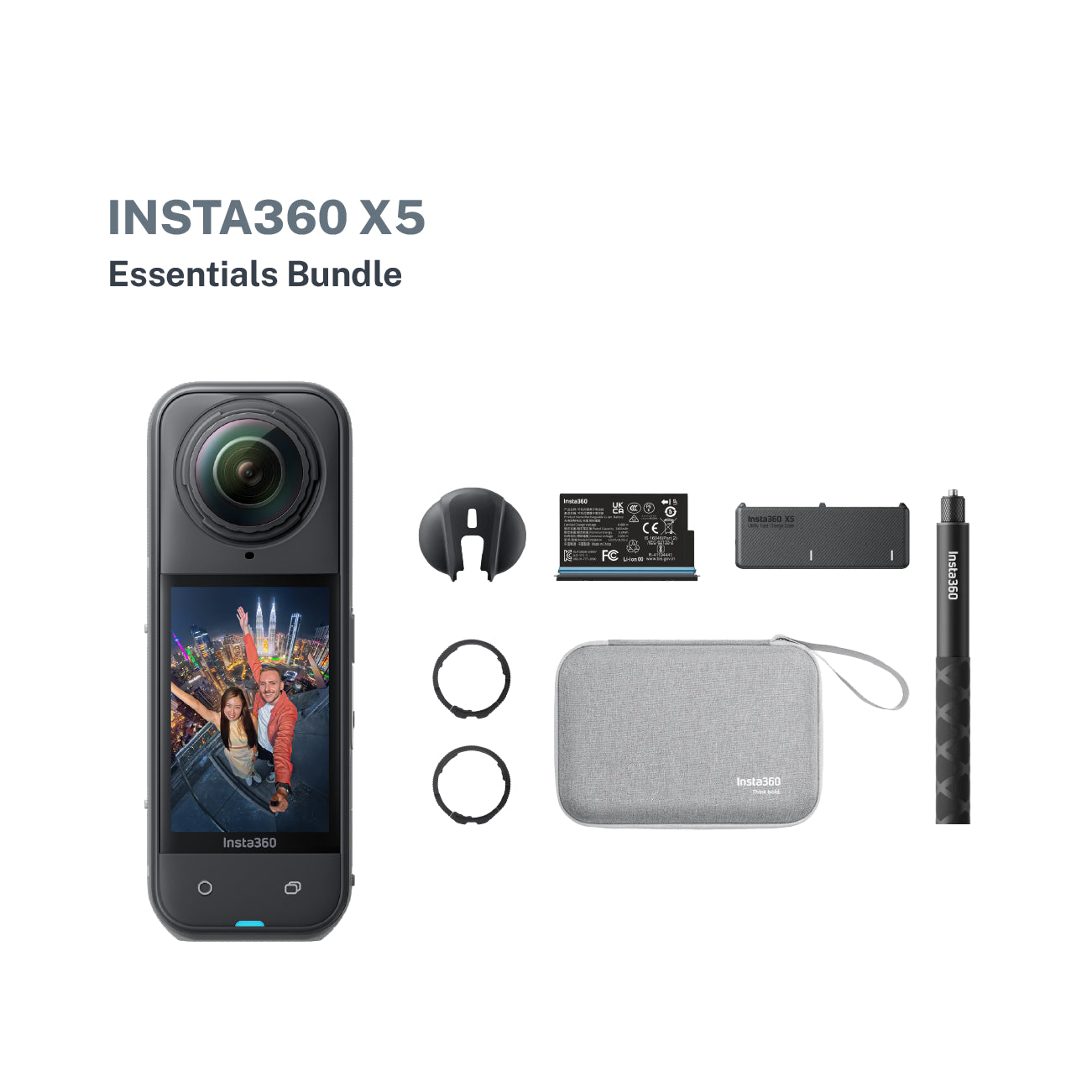 Includes X5 Standard Bundle, X5 Standard Lens Guards, 114cm Invisible Selfie Stick, X5 Lens Cap, Battery, X5 Utility Fast Charge Case, X5 Carry Case